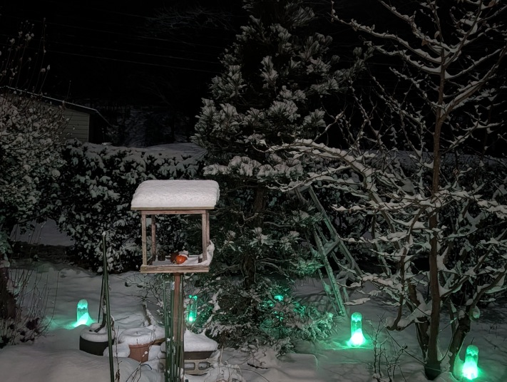 一級寒気に覆われ 日中の最高気温ー1℃、午後3時前から雪が降って午後9時までにエサ台の屋根は約5センチ積もっている |